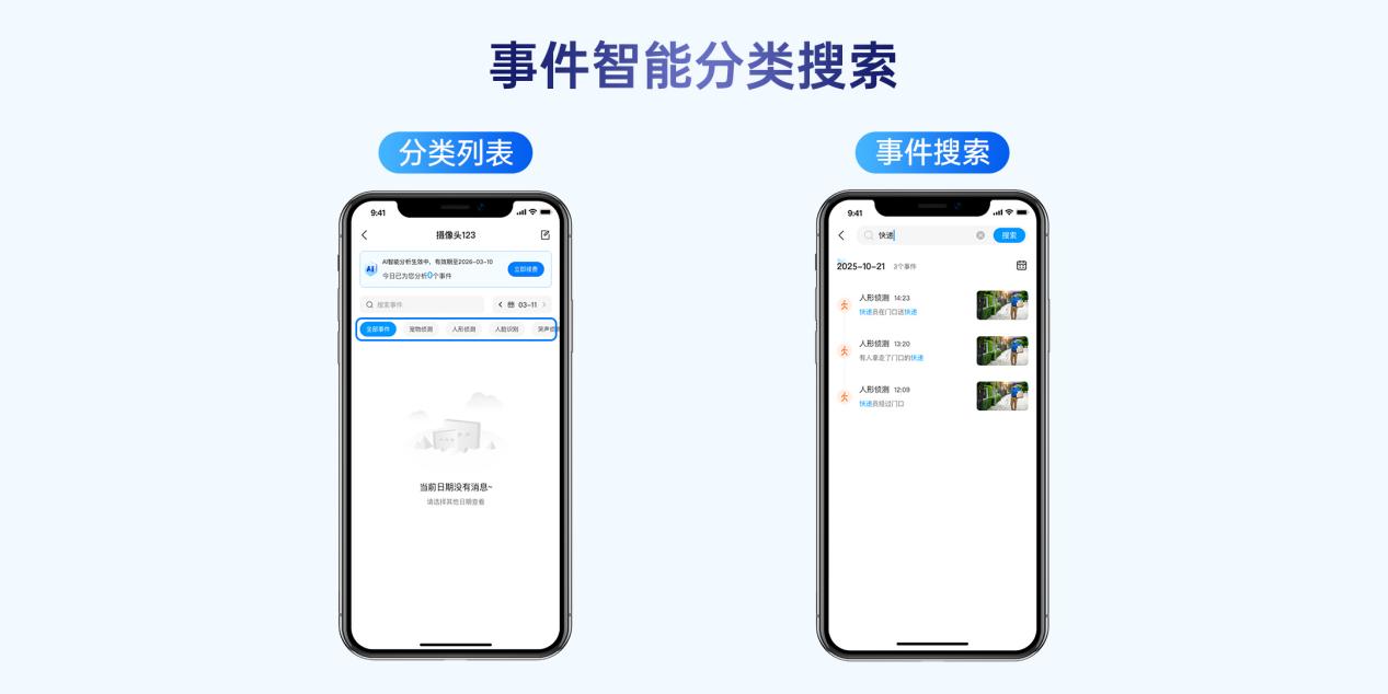 借助星乔大模型与DeepSeek的双重智能分析能力,APP可自动对告警事件进行精准分类,如火焰侦测、烟雾侦测、快递包裹、车牌侦测、人形侦测、宠物侦测、车辆侦测、哭声侦测、人脸识别等多种场景识别,用户可通过关键字搜索历史事件,如输入“快递”,就能快速找到所有包裹送达的记录,无需在海量视频中逐一筛选。
